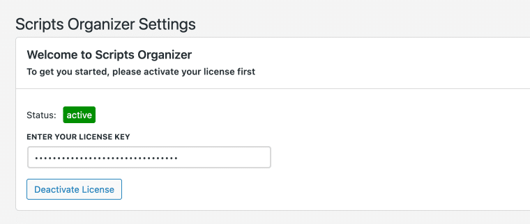 After install, go to the WordPress dashboard of your target site and click at the Scripts Organizer menu on the sidebar then activate the plugin by using a key on Dashlane’s secure note named “Scripts Organizer”