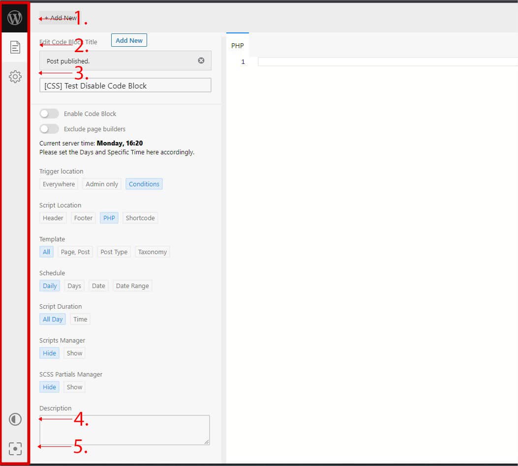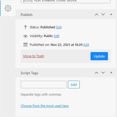 Add title: A place where you put the title of the block, we will add the type of the code inside square bracket and put at the front of title. For example, [CSS], [JS], [PHP], or [CSS+JS] so the example title will be