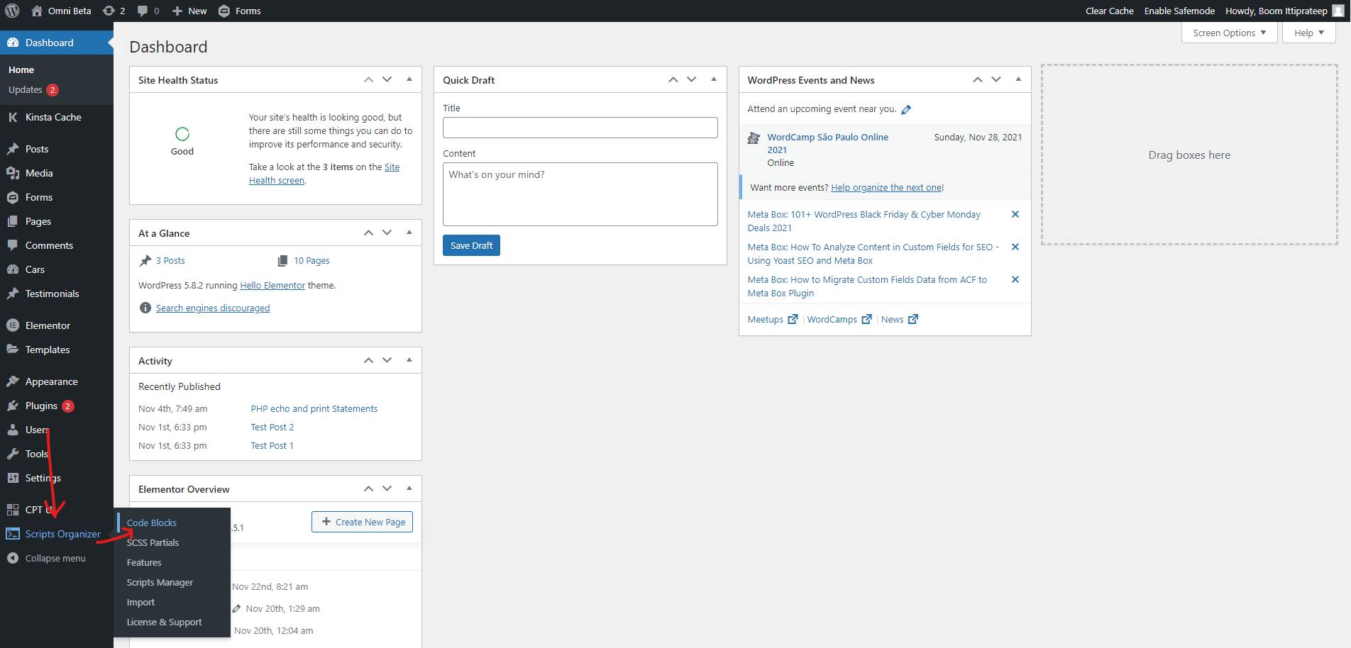 At WordPress Dashboard, mouse hover at the Scripts Organizer menu on the sidebar and select Code Blocks