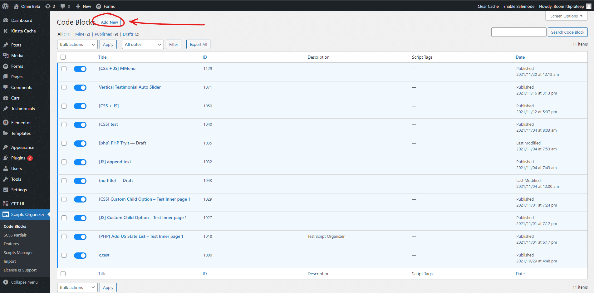 You will reach at a table page that shows all available Code blocks on the site click Add New