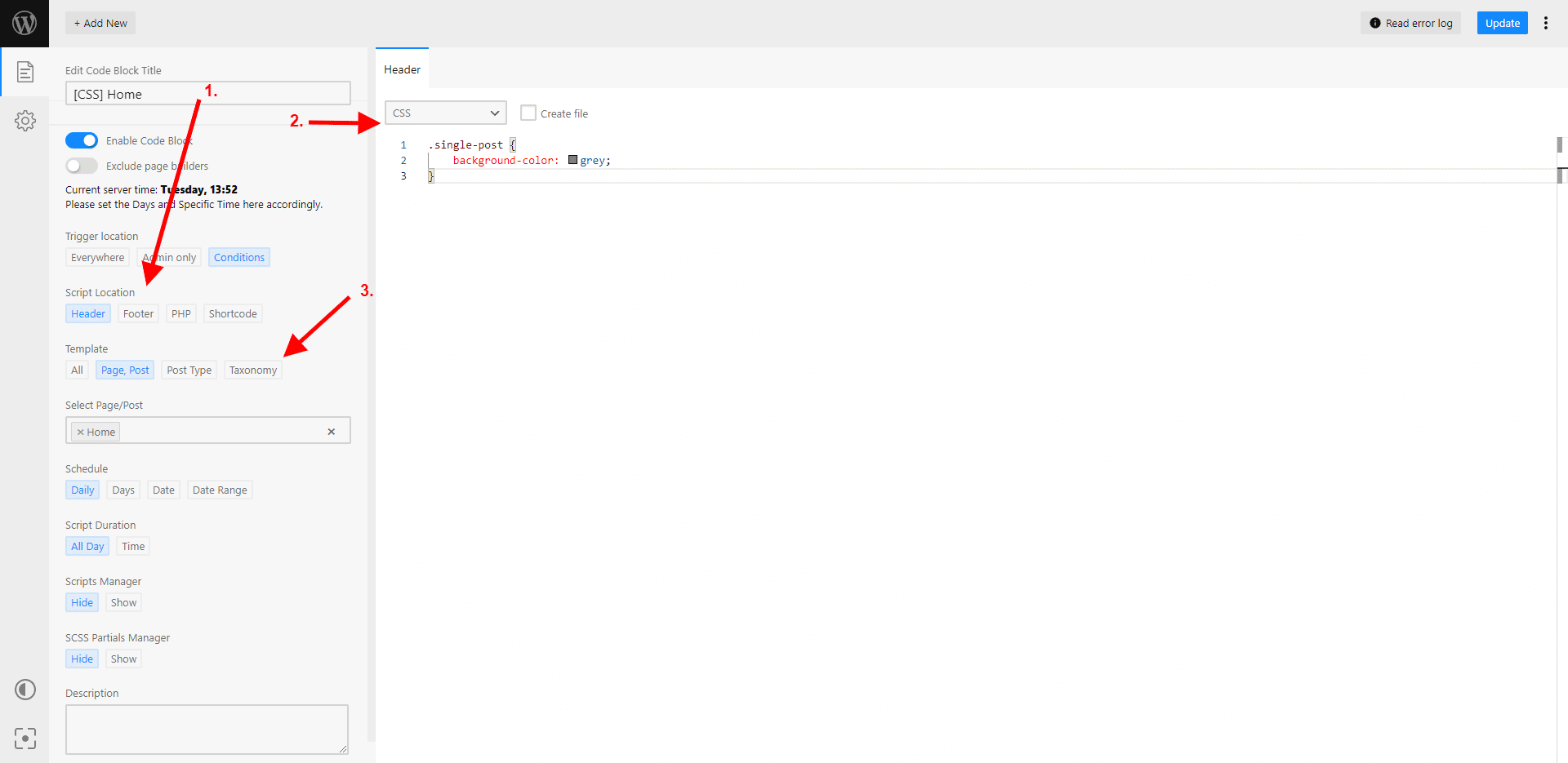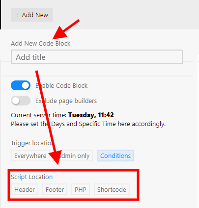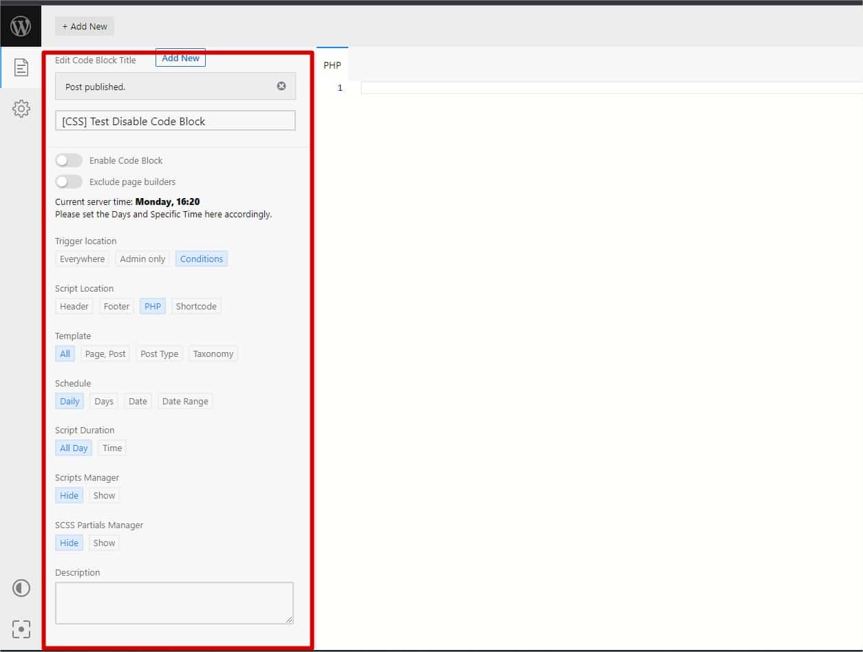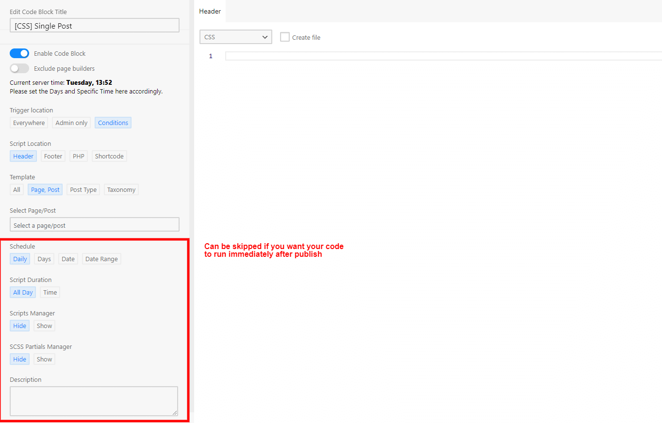 You can skip the rest options if you wish to have this script run after save (don’t forget to turn the Enable Code Block switch to on)