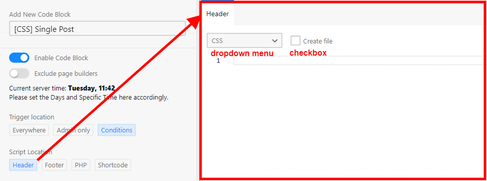 Once we select the location, there will be a tab appear on editor area and a dropdown menu to choose which type of language you are going to add. Also, there is a checkbox titled Create file which allow us to choose whether to create this script as a file or just add it inline on the page