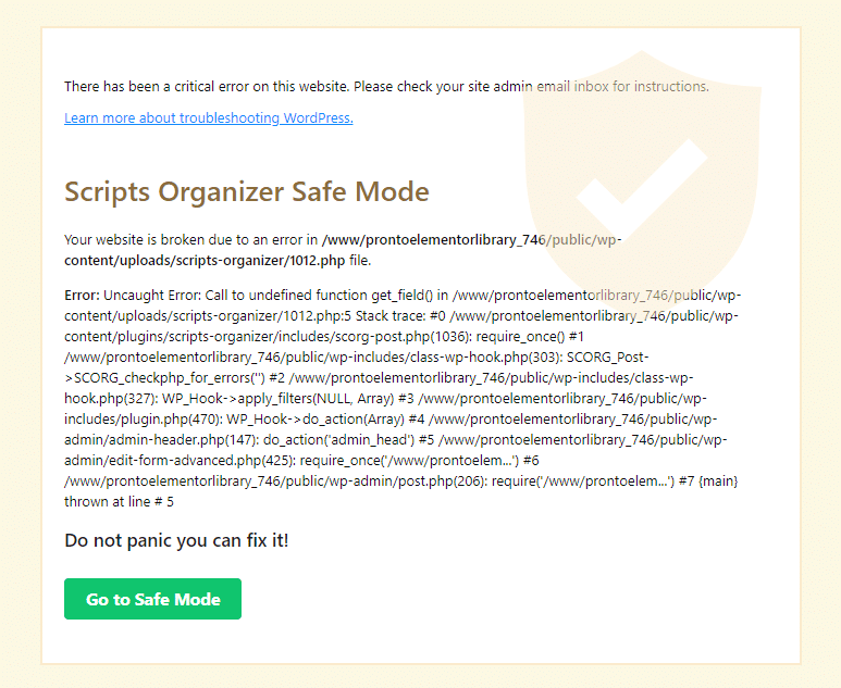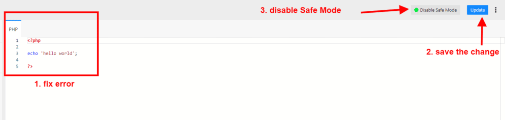 After you fix the error, save the code and disable Safe Mode to return the site to normal state again.