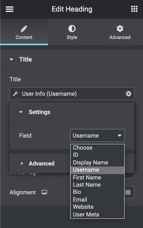 Click at the Dynamic Tags icon at the Title field of Heading widget and choose User Info