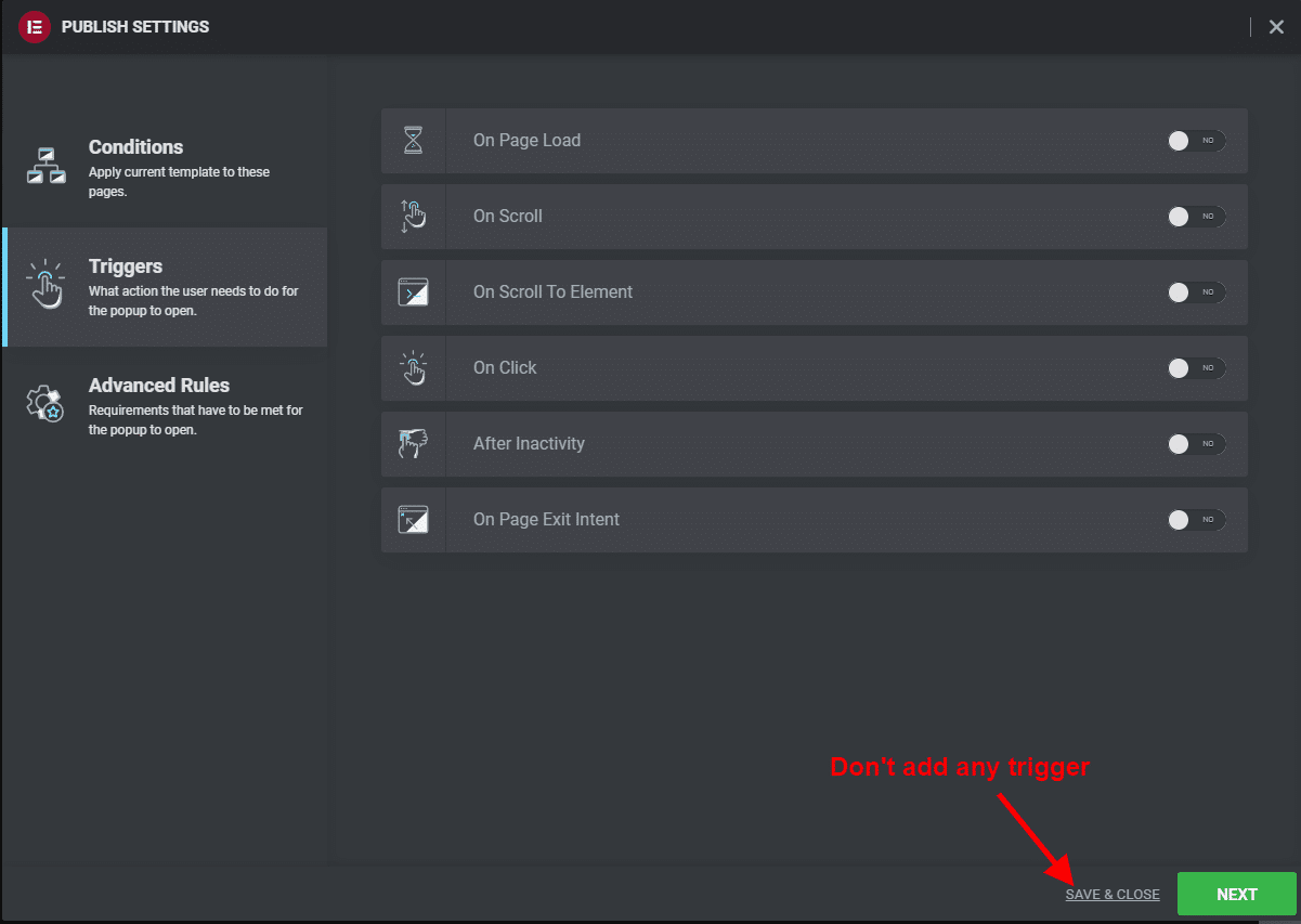 - Add Nav Menu widget into the popup area adjust the color and size of the text to match with your given mockup. After that, publish the popup without selecting any trigger, just save it.