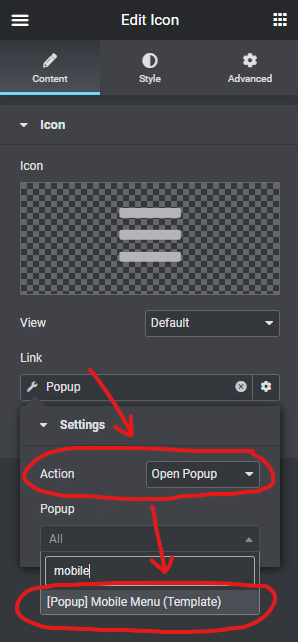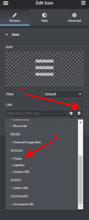 - Go to your header, add Icon widget to the page content and set the trigger to be the popup that you have created on Step 3