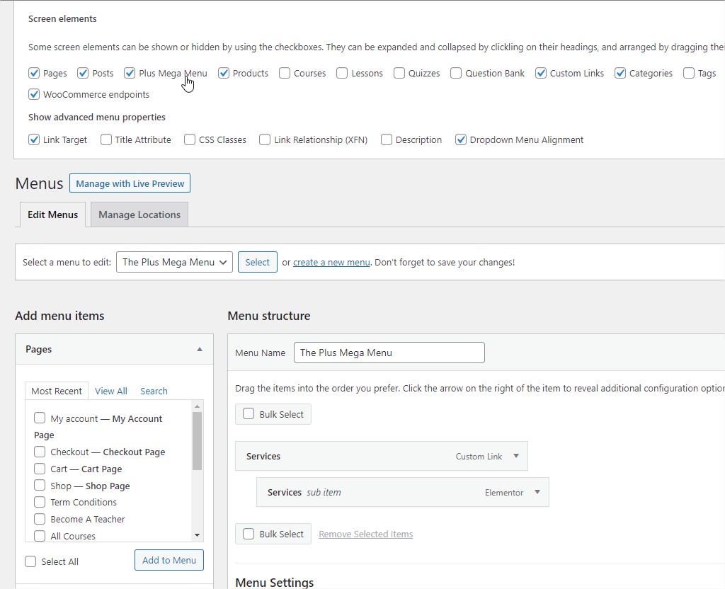 4. Go to Appearance > Menus, Create new menu entries and add your Plus Mega Menu under Custom Link (if you cannot found Plus Mega Menu on the left try activate it at the Screen Options first)