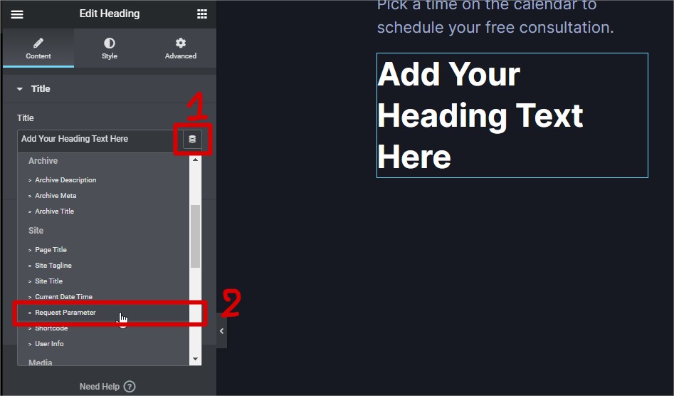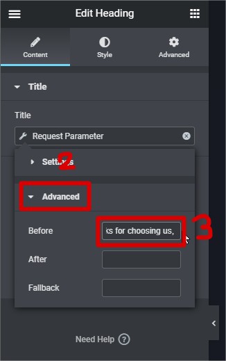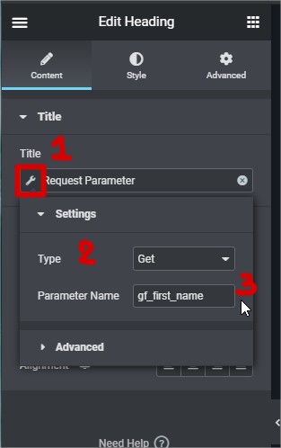 After that Edit your confirmation page with Elementor. We will be working on the Heading widget by click on the icon on the right then select Request Parameter