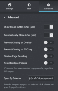 2. On the popup advanced tab -> Open By Selector, insert a[href=”#popup-contact”] to the input field